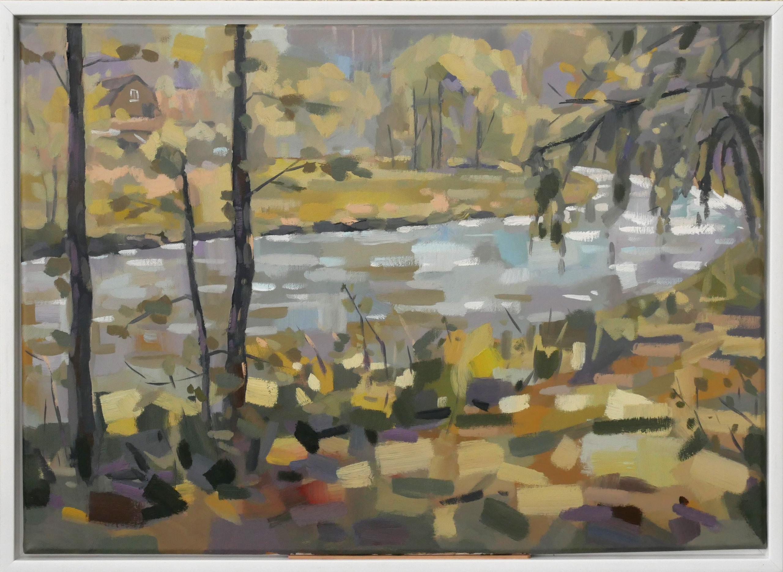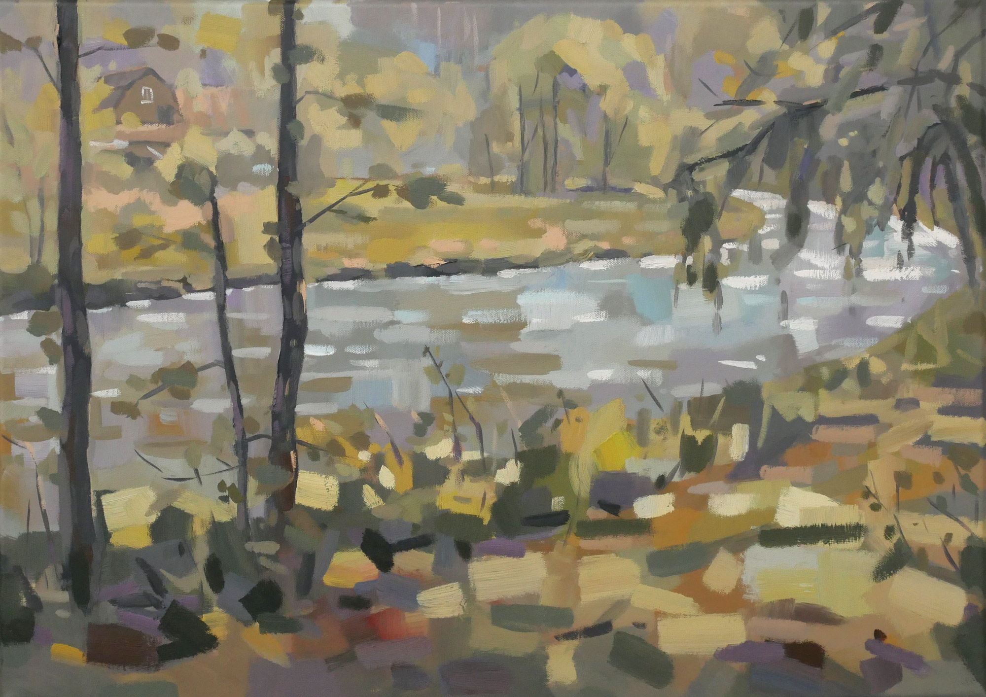 Herchen: Ölmalerei von Frank Henning auf Leinwand, Pleinairmalerei die vor dem Motiv in Herchen entstanden ist. Das Bild zeigt in impressionistischer Malweise die Sieg, Botanik im Vor- und Hintergrund.
